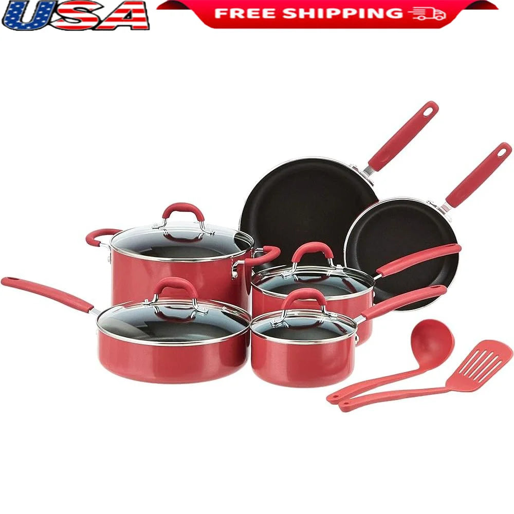 About this item VERSATILE 12 PIECE COOKWARE SET - This cookware set contains everything you need to outfit a kitchen. Its' durable aluminium body and delivers excellent heat conduction all around with no dead zones or hot spots. ULTRA NONSTICK & HEALTHY - Multi-layer nonstick interior coating is made without PFOA&BPA and provides ultimate food release and vivid nano-ceramic exterior for a better cooking experience. SOFT STAY COOL HANDLE -Soft silicone handle stays cool to the touch and provides a comfortable, non-slip grip during daily use. OVEN & DISHWASHER SAFE - It's suitable for all hobs except for induction, oven safe up to 177℃(350゜F). Dishwasher safe allows a quick and easy clean. PACKING LIST - This set includes 6. 3 inch, 1. 5 quart saucepan with lid; 8 inch, 3 quart saucepan with lid; 9. 5 inch, 6 quart casserole with lid; 9. 5 inch, 3 quart sauté pan with lid; 8 and 10 inch skillets; slotted spatula and solid spoon.