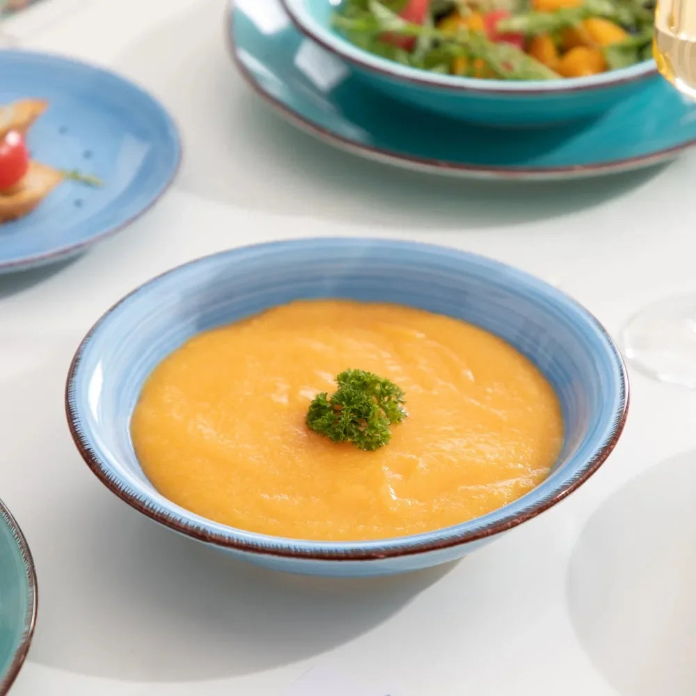 Complete collections. The BONITA crockery set in a strudel design consists of 6 dessert plates Ø19.5 cm, 6 soup plates Ø20.5 cm, 750 ml and 6 dinner plates Ø26.7 cm. The unique blue color scheme simply reminiscent of blue skies and a pleasant vacation!